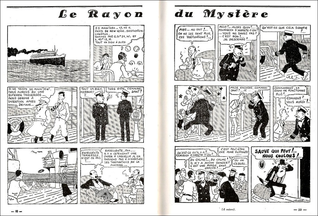 Le dessin du Rayon du mystère pour la parution dans le journal de Tintin est celui du Petit Vingtième mais reformaté et relettré et avec des demi-tons de noir ajoutés et une couleur rouge d'appoint, en aplat et demi-tons.